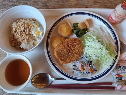 今日のメニューは、コーンそぼろどんぶり、カレーコロッケ、ホタテフライ等々です。
