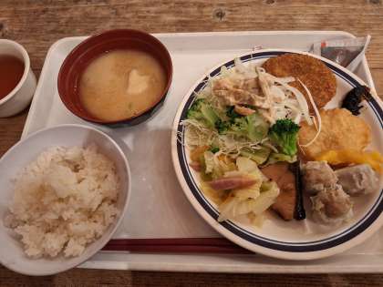 午後5時から、食堂で夕食をとりました。メニューがたくさんあり、みんなお腹いっぱいいただきました。次々おかわりをするので、食堂の方が、その度にフライを揚げてくださっていました。
