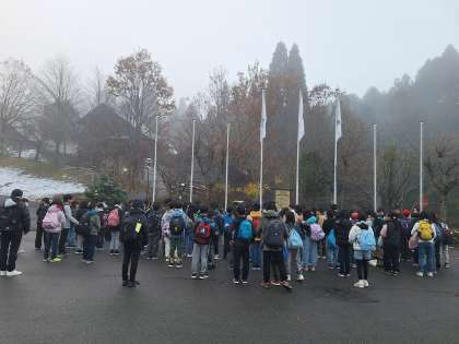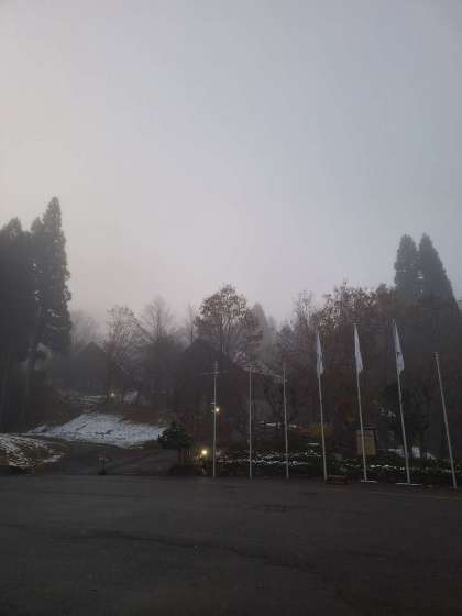 気温2.7度、朝霧の中での朝の集いです。所員の方のお話の中で、霧の上は晴れているとのことでした。だんだん明るくなってきました。