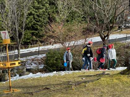 フライングディスクゴルフの様子です。ゴールにめがけて投げています。