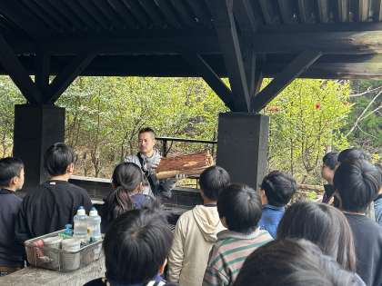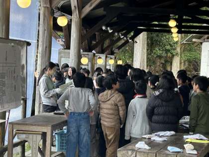 かまど係、ごはん係、おかず係、それぞれ説明を聞いています。