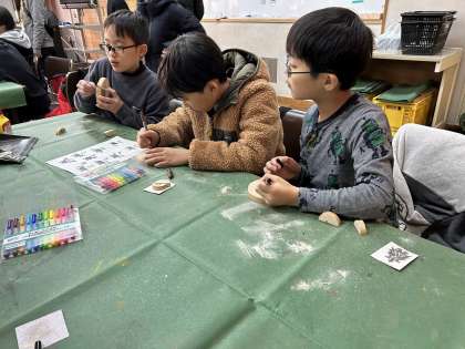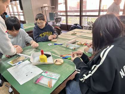 雪で地面や遊具が濡れていますので、ウッド写真立てを作成しています。