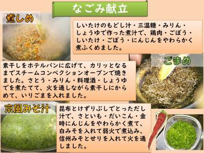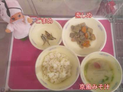 今日は1月のなごみ献立の日でした。献立は、「麦ごはん・煮しめ・ごまめ・京風みそ汁」でした。今月のなごみ献立は、お正月に食べるおせち料理です。おせち料理にはそれぞれ、込められた願いや意味があります。