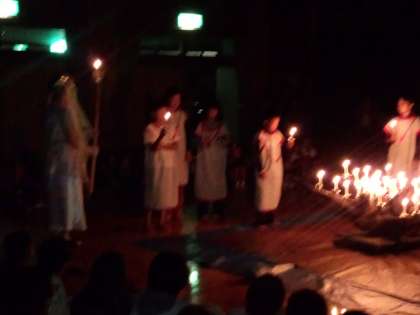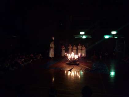 ファイヤーの初めに,5人の火の子たちが火の女神さまから火をもらい,キャンドルに灯しました。真っ暗な部屋にキャンドルの炎がゆらめき,とてもきれいでした。