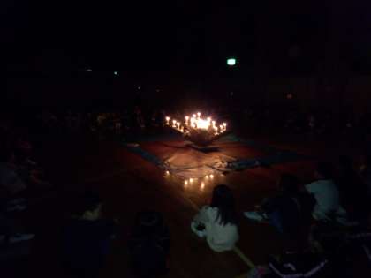 最後の夜の活動は,キャンプファイヤーの予定でしたが,雷雨があったため,『キャンドルファイヤー』を行いました。レクリェーション係の子どもたちが早くから準備し,本番前にも打ち合わせやリハーサルを行っていました。