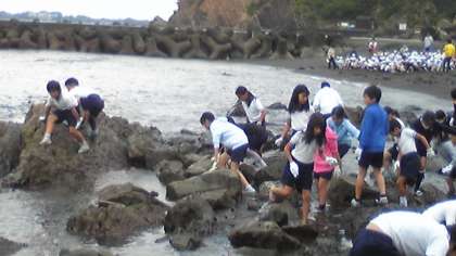 天候不良のために1時間遅れで活動をはじめた磯観察ですが,子どもたちは海の中に入って,たくさんの生き物を見つけました。