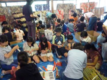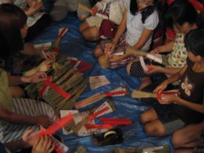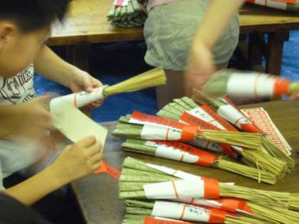 『八幡さんの厄除けのお守りは〜 これより出ます〜 御信心の御方様は〜 受けてお帰りなされましょう』毎年祇園祭でこのような童歌とともに売られる八幡山の厄除けのちまき。長い歴史の中で受け継がれてきた祇園祭の厄除けのちまき。5年生は10日水曜日にそのちまきの帯まき体験を行いました。八幡山の保存会の方や京都学園大学の学生さんに教えていただきながらちまきの帯まきを体験した子ども達。ちまきがなぜ飾られるのかお話を聞き,自分たちがまくちまきが実際に売られることなどを聞くと『え〜っ?!そうなん?』『がんばらなあかんやん』『俺できるかなぁ〜』などの声がちらほら聞こえてきましたが,いざ始まってみると真剣な目つきで帯まきをしている姿が見られました。難しい,といわれていたちまきの帯まきでしたが,首尾は上々。たくさんの帯を巻かれたちまきがどんどん完成していきました。お祈りを受けて厄除けのちまきとなったちまきが宵々々山,宵々山,宵山などの時に,あの童歌のメロディーにのって売られます。一年間の無病息災を願って,たくさんの人の手に渡っていきます。みんながまいたちまきがたくさんの人の手元で,その思いを受け止めるものであってほしいですね。