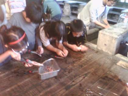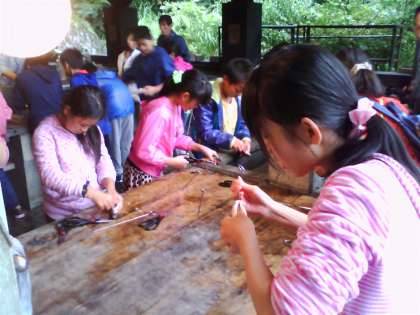 午後には,午前中につかんだ魚をさばいて塩焼きにして食べました。初めて魚をさばく子どももたくさんいました。生命の大切さを感じながらの体験でした。