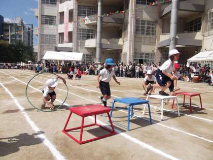 エントリー種目の玉入れでは,前半低学年,後半高学年とそれぞれが協力して籠をめがけて玉を投げました。籠の中には,高倉小学校創立20周年の記念手ぬぐいで作ったえんじ色の「高倉玉」が入っていて,競技に花を添えていました。3年生の「台風の目!」では,みんなで息を合わせて棒を運んだり,跳んだり,潜ったりと,とても楽しそうでした。バラエティ走では,学年に合わせて,くぐって とんで ポン!→ポポン!→ポポポン!と難易度もアップ!初めてする競技も楽しく頑張りました。