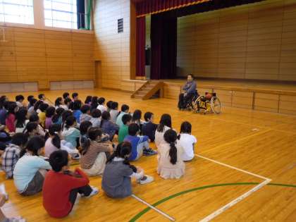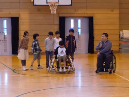 10月22日(水)の3・4時間目に,車いすバスケットボール選手の山本さんに来ていただきました。普段の生活の様子についてお話を聞いたり,疑問に思ったことを質問したりすることで,車いすで生活していて困ったことや,どのようにしてそれを乗り越えてきたかということを詳しく教えていただきました。その後、車いすバスケットを実演していただき、実際に体験もしました。車いすバスケットボール用の車いすの動きの速さに,驚きの声と歓声が上がっていました。