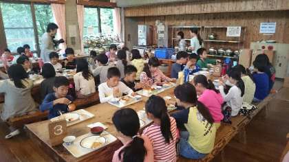 ミーティングルームで「朝の集い」を行いました。健康観察や今日の予定の確認をしました。その後,食堂に移動して,昨日作った「My 竹ばし」で朝食をいただきました。次の活動は「天狗杉登山」です。さあ,元気に出発!