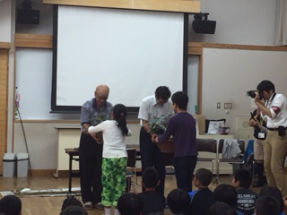 最後に,花背の地域の方に,学校で育てていたちまき笹の鉢をお渡しして,新しい鉢をいただきました。また,大きく育てたいです。