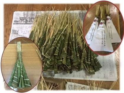 出来上がったちまきに,「京都市立花背小中学校」「京都市立高倉小学校」の校名とお互いの校章の入った帯を巻きました。