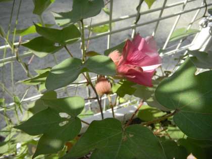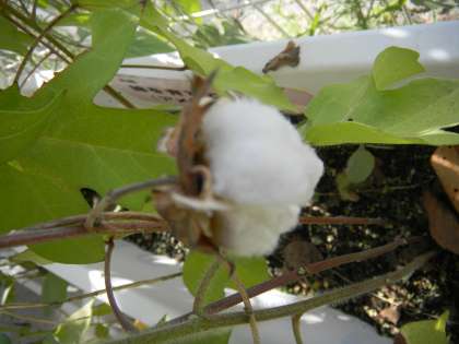 5年生が育てていた綿がきれいな花が咲いたあと、実がつき、はじけていました。