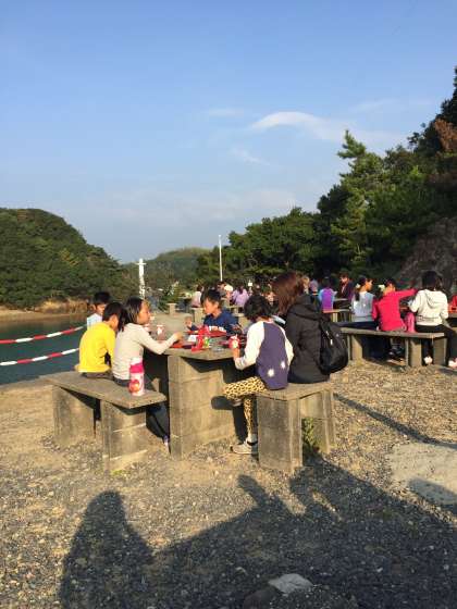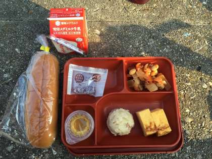 朝食を,深谷水道横の炊事場でいただきました。外はぽかぽかと暖かく,とても気持ちがいいです。