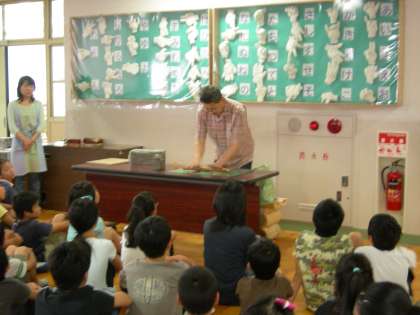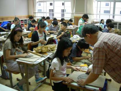 午前9時 いよいよ花器作りが始まりました。まず初めに陶芸の先生の話を聞きました。粘土を伸ばして土台を作り,引き延ばした粘土をその土台の上に積み上げていきます。つなぎ目をなじましていくのがコツです。作り方を話と実演で教えてもらい,一人一人が作ることになりました。それぞれのこだわりのデザインを形にしていくのに苦労や工夫があったようです。約半日かけてそれぞれのオリジナルの作品ができあがりました。できた作品をかわかし,素焼き,釉薬をつけて本焼きと進みます。夏を過ぎてできあがった花器に花を生ける日が楽しみです。