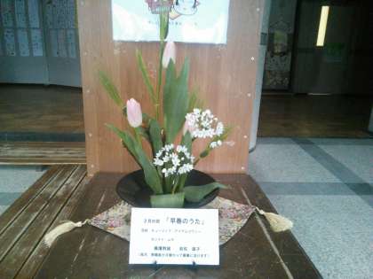 花材は,チューリップ・アイアムコワニー・ゼンマイ・ムギです。