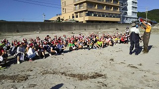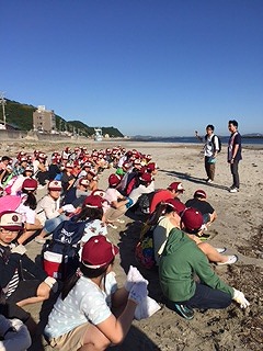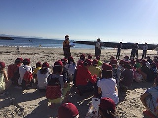 浜に移動して地引き網体験の始まりです。お話を聞いて,みんなで協力しながら網を引いています。