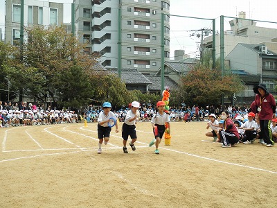 初めてのリレーです。一人半周ずつですが,バトンを落とさないように意識しながら,少しでも速くバトンを渡そうと頑張る姿見られました。