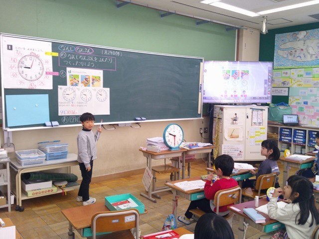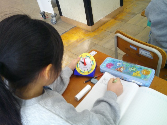 時計の1目もりは1分を表すことや5、10、15・・・と5分刻みで「何分」を調べると便利なことに気づきました。