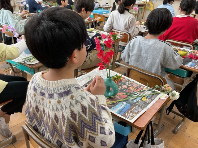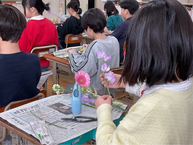 生け花体験をしました。池坊の方に来ていただき、お花の生け方や、ハサミの持ち方などを教えていただきました。お出迎えの気持ちを込めて、お花を生けることができました。