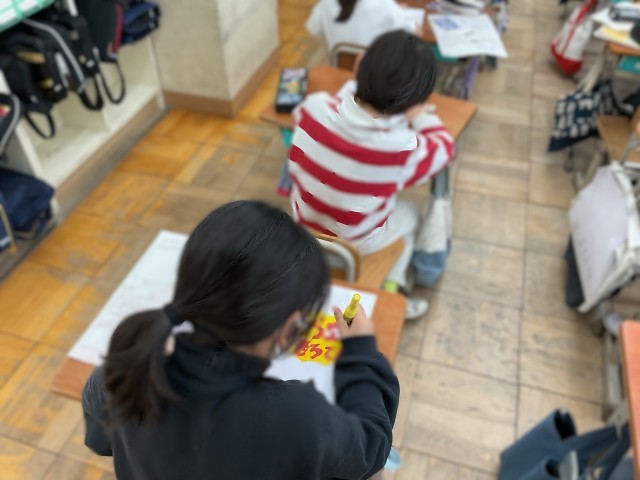 子どもたちは、これまでの学習をふり返りながら、「どんな危険があるのか」「だれに向けて知らせたいのか」「どんな表し方なら気づいてもらえるか」を考え、自分たちのアイデアを生かしてサインをデザインしました。色の使い方や形、言葉選びなど、見る人に伝わりやすい表現を工夫しながら、一人一人が真剣に取り組む姿が見られました。