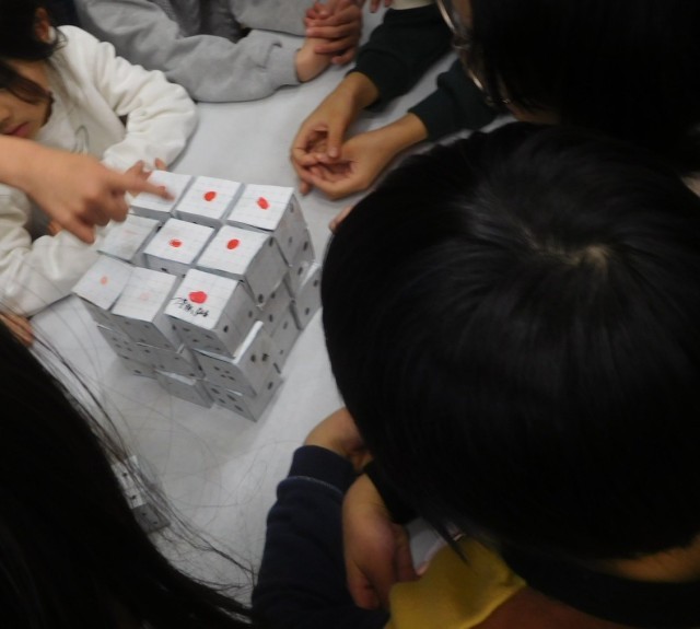 みんなで協力して大きなサイコロ作りを楽しみました。