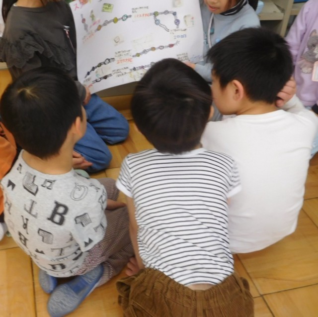 1年生を招いて発表会をしました。1年生が熱心に聞いてくれるので、みんなうきうきしながら発表していました。