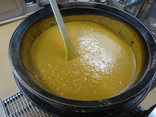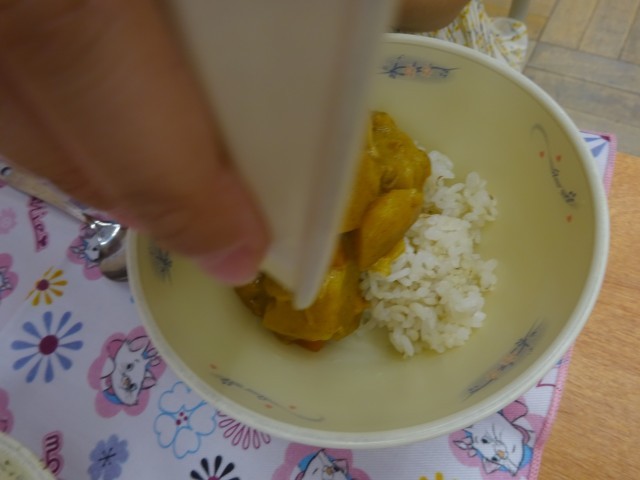 給食のカレーは、ルーから手作りです。サラダ油やバター、小麦粉をよく炒めてからカレー粉を加えて作っています。中間休みくらいには、給食室からカレーのいい香りがしていました。子どもたちもカレーを楽しみにしていた様子でした。教室で、ごはんの上にカレールーをかけていただきます。「カレーが完成したよ!」と1年生も喜んで食べていました。
