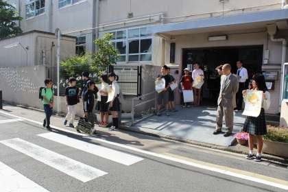 本日は日曜参観の日です。今日は中京中学校の生徒も一緒におはよう運動を実施しました。登校する子どもたちは,中学生の「おはよう」のあいさつにちょっとびっくりした様子でしたが,中学生の気持ちのよいあいさつで笑顔で登校できました。そして,日曜参観も笑顔いっぱいで学習することができました。