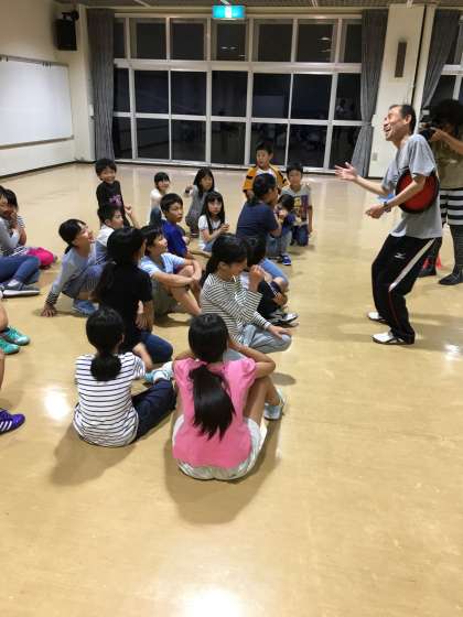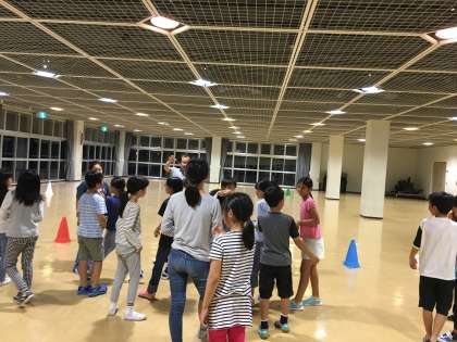 雨が降っていて足元も良くないのでナイトハイクは中止になりました。洛中小学校だけなのでクーラーの効いているプレーホールでのスポーツ大会に変更になりました。先生の盛り上がるぞーとの掛け声に,子どもたちの声がなかなかそろいません。