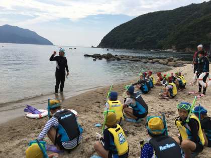 見つけた生き物を発表します。スノーケリングの先生も見たことない魚を見つけたようです。「すごい!」と言ってもらいました。