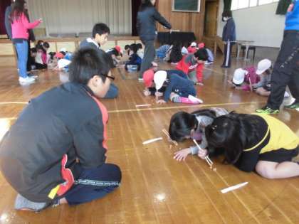 健康委員会主催「お箸を使ったブロック積み大会」低学年の部が開催されました。1分間に1cm角のブロックの5個積みが何回できるかを数えます。1年と2年が数え合いっこをします。集中してがんばっていました。