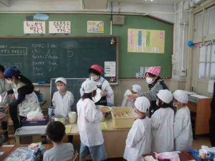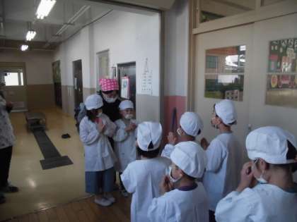 エプロンを着て,並んで給食室へ。「心を込めていただきます。」挨拶も上手にできました。重たい物もありますが協力して運びます。
