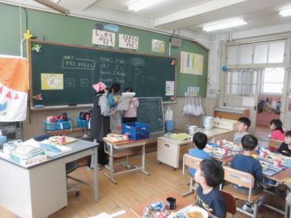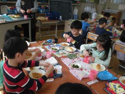 初日はいつも「スパゲティのミートソース煮」「ほうれんそうのソテー」です。パンと牛乳とリンゴゼリーもついています。みんな楽しそうに食べていました。