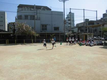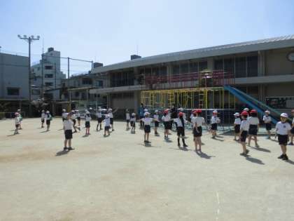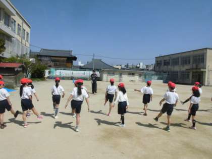 本校の運動会は縦割りグループを基本に赤白に分かれて行います。赤白の走力が偏らないよう縦割りグループを決めるまでに短距離走のタイムを測りました。今日は中学年合同の体育です。準備運動は学年で行い50m走をしました。