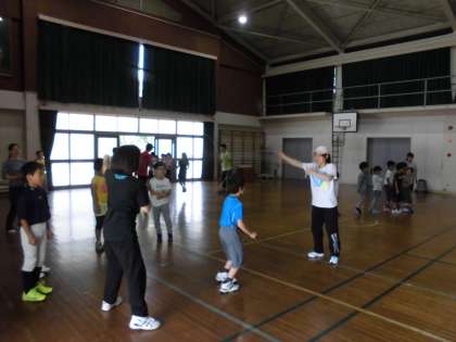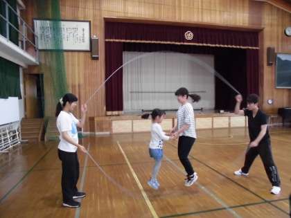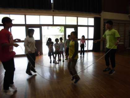 3グループに分かれて体操の後,さっそく教えてもらいました。最初は真ん中に立って一緒にジャンプ,同じタイミングで跳んでいると縄をタイミングよく回してくださいます。あっという間に跳べるようになり,パフォーマンスで見せてもらった技に挑戦し始める子どももいました。