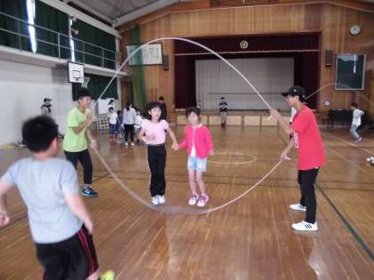 1時間半があっという間に過ぎて(縄を回す学生さんたちの腕はパンパンだと思いますが)子どもたちの笑顔がたくさん見られました。感じてほしいことは「やってみよう」「失敗したっていい」「もっとやりたい」「できるようになりたい」「最後まであきらめない」そんないろいろ気持ちです。お友達の良さも見つけた貴重な時間になったと思います。
