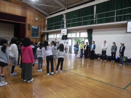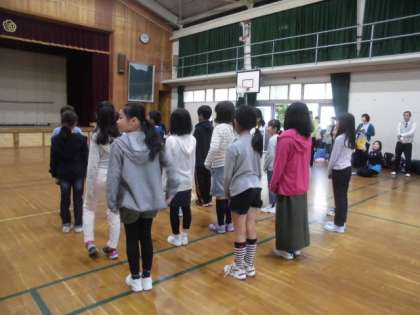 雨が降り出したので,体育館で出発式を行い,「男女協力して助け合い,楽しい思い出をつくろう!」のめあてを確かめました。