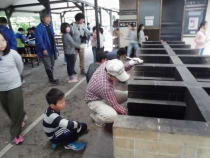 切りあわった具材を入れた鍋をかまど班に渡します。火おこしはなかなか難しかったようですが所員の方や乾先生に手伝ってもらって上手に火をつけることができました。調味料もきちんと量って渡されているので味も保障つきです。