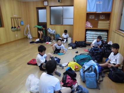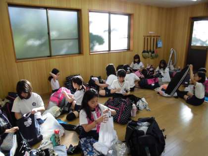 みんなの期待ナンバー1の磯観察に出かける用意です。持ち物はしおりに書いてあります。みんなハイテンションで楽しげに準備をしています。しかし,やはり「軍手がありません。」「赤白帽子がありません」という報告?がありました。いいお天気の中,宮崎浜まで歩きます。