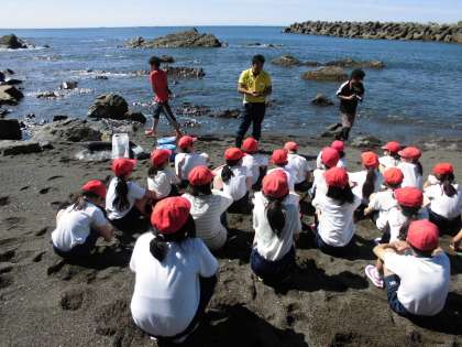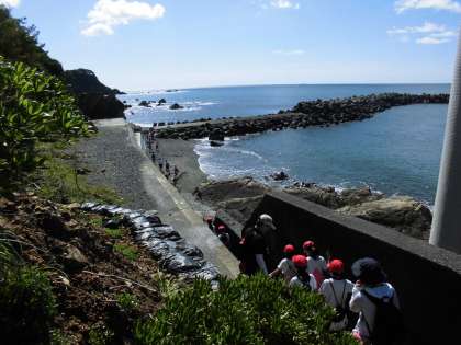 みさきの家から宮崎浜までは10分弱です。しかし,一旦坂道を上り,細く切り立った場所を通り抜け,足を取られる砂浜を歩くため,結構きつい道のりです。楽しみを目の前にがんばって歩きました。
