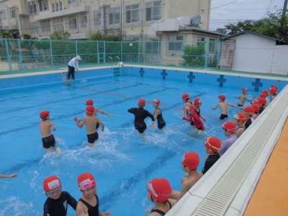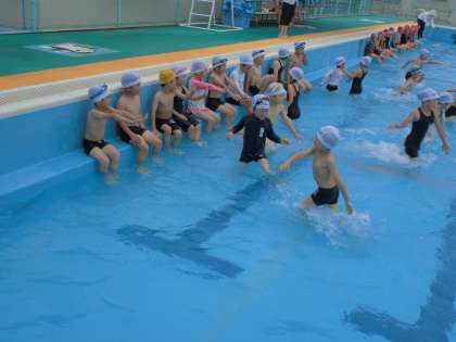 6月5日に1・2年生が,低水位のプールで水遊びをしました。プールに入るときの約束を2年生が見本になって,1年生に教えてくれました。