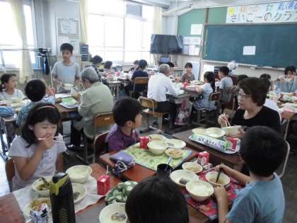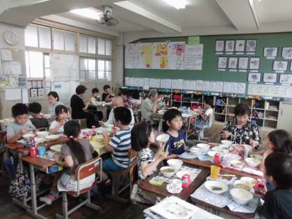 1組は教室に戻って食べました。グループごとに楽しくお話をして食べていました。