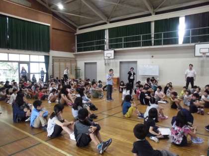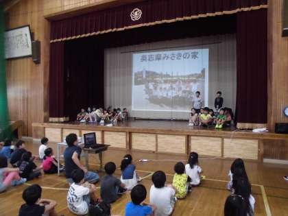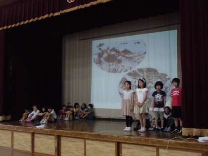 5月に行ったみさきの家のことを発表しました。自分が楽しかったことや学んだことを場面に分けて全校児童に聞いてもらい,感想を言ってもらいました。練習の時よりは大きな声で言えました。