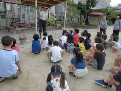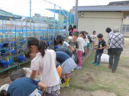食育指導員の先生に来ていただいて,土嚢にさつまいもを植えました。一人一株しっかり植えることができました。水やりが大事です。しっかり育てて秋にはおいしいお芋を食べたいです。