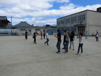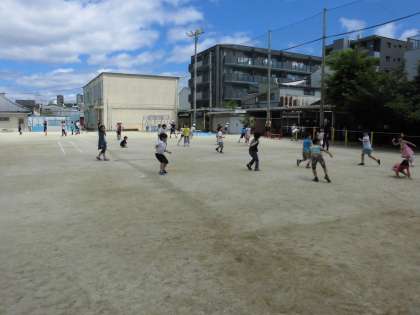 梅雨の晴れ間,水曜日のジャンボ遊びです。クラスみんなで遊びます。汗びっしょりで駆け回っていました。