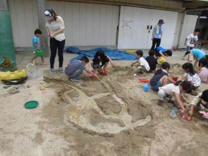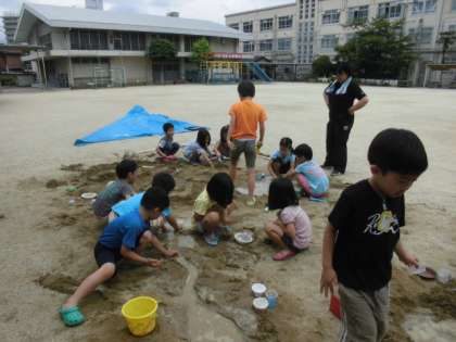 砂遊びをしています。幼稚園や保育園でたくさん遊んできたことと思いますが小学校になると遊びを通した学習が減ってきます。この発達段階の児童にはとても大切な学習です。子ども達の歓声が職員室まで響いてきました。友達と声を掛け合いながらどんどんダイナミックな砂の造形が出来上がりました。
