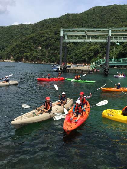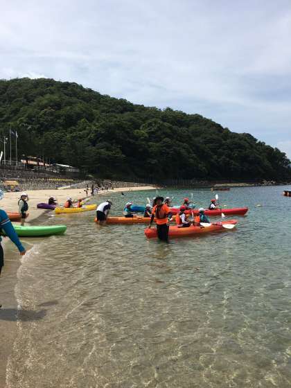 まず,オールの使い方を習います。水をかく感じをつかんだら,いよいよインストラクターの方について,海へとこぎだします。