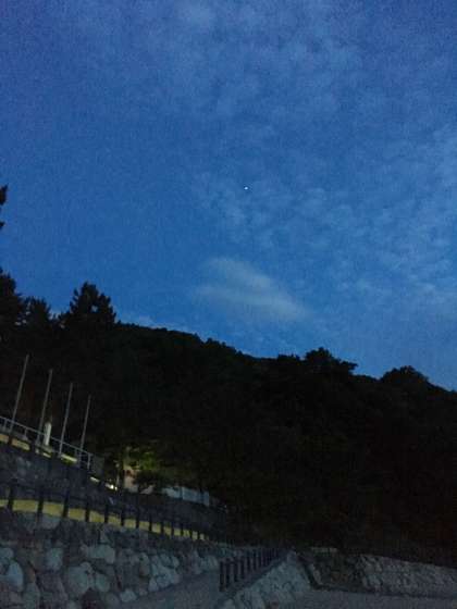 大浜でのキャンプファイヤーが始まりました。少しずつ暗くなってきて気分は盛り上がってきました。風が強いので火の粉が散って危ないです。いちばん星が光りました。
